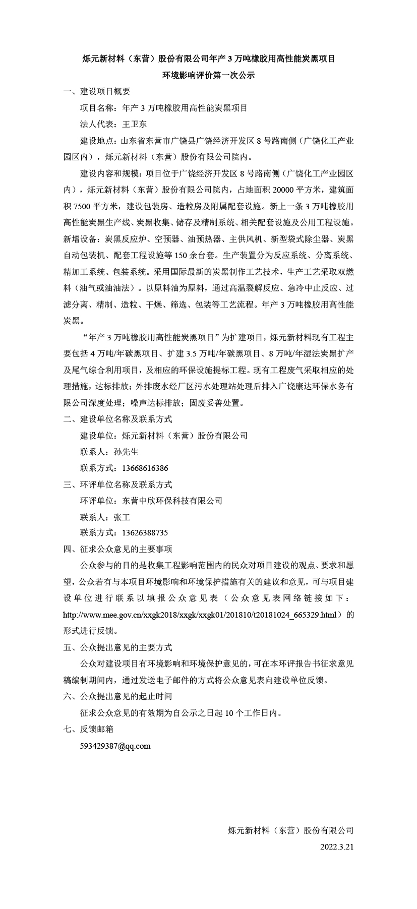 年産(chǎn)3萬噸橡膠(jiāo)用高性能(néng)炭黑項目(mù)環境影響(xiang)評價第一(yi)次公示